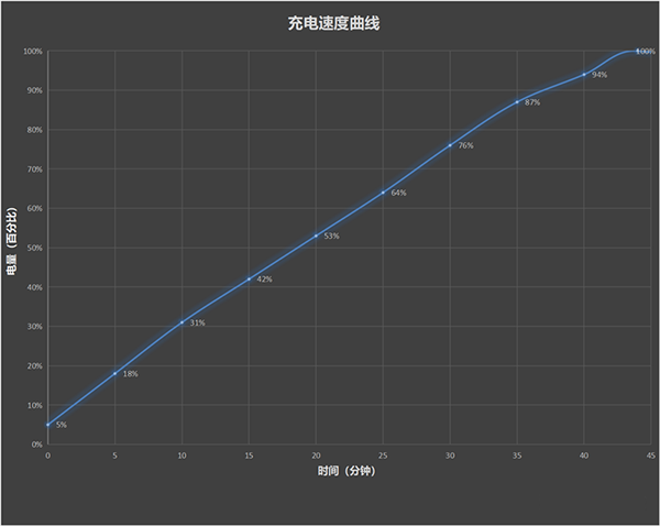 經(jīng)過(guò)測(cè)試,手機(jī)電量從5%開(kāi)始充電,5分鐘即可充至18%,10分鐘充電至31%,20分鐘即可充至一般的電量,達(dá)到53%,半小時(shí)充電76%,完全充滿僅需要44分鐘。