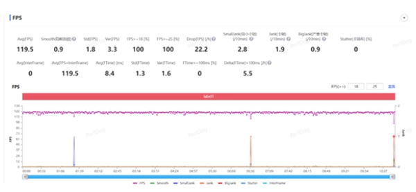 先來測試一下國民游戲《王者榮耀》,開啟滿畫質(zhì),120幀,一局游戲下來,平均幀率為119.5幀幀,這個幀率幾乎是沒有波動的,即便是打團(tuán)的時候,幀率依然穩(wěn)定。因?yàn)橥跽邔π阅艿囊鬀]有那么極致,所以手感溫度上升的不明顯。