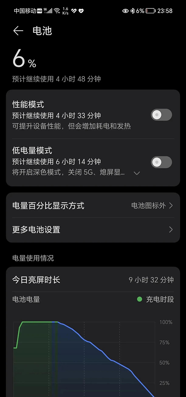 說一說實(shí)際的續(xù)航吧,早上7點(diǎn)鐘手機(jī)滿電出門,一直到晚上23點(diǎn)半,這一整天使用下來,手機(jī)亮屏?xí)r長(zhǎng)為9小時(shí)32分鐘,手機(jī)剩余電量還有6%,原本我想把這僅存的6%電量給徹底用完榨干,看看這手機(jī)到底能堅(jiān)持多久才會(huì)關(guān)機(jī),看看這手機(jī)的總續(xù)航時(shí)間到底有多長(zhǎng),然而我低估了這手機(jī)了,直到最后我崩潰了。