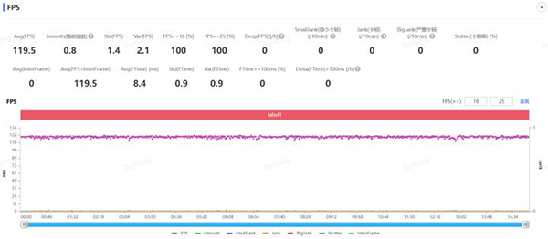 本輪測試模式為排位賽,單局游戲時(shí)長15分鐘,實(shí)測平均幀率119.5FPS,穩(wěn)幀指數(shù)0.8,全程同樣無明顯掉幀現(xiàn)象,操作非常絲滑。