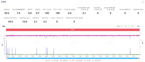 本次測試地圖為雨林,游戲時(shí)長21分鐘,具體幀率走勢如下,平均幀率59.6FPS,穩(wěn)幀指數(shù)1.8,同樣非常平穩(wěn)、絲滑。