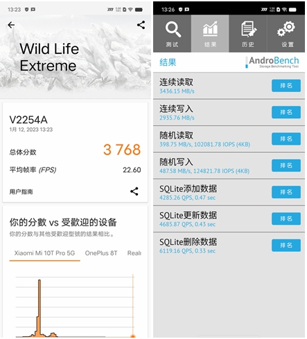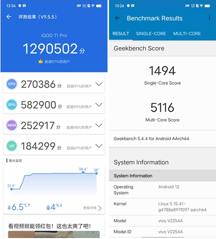 另外在安兔兔性能評測中iQOO 11 Pro跑分成績129萬分,GeekBench5的CPU單核跑分1494分,多核跑分5116分,偏向GPU性能測試的3DMarkWildLifeExtreme測試的分?jǐn)?shù)為3768分,平均幀率22.60。