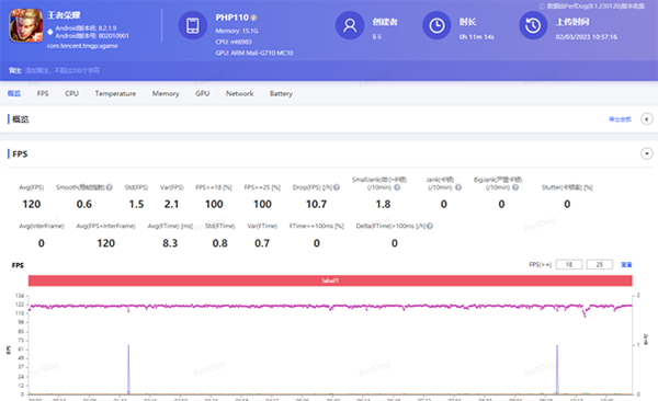 在測試《王者榮耀》時,一加Ace2V可以開啟極高幀率+高分辨率的設置,游戲對局中也絲毫沒有卡頓、延遲現(xiàn)象發(fā)生,平均幀率達到了120幀,天璣9000旗艦芯對目前的手機游戲是可以輕松駕馭的。