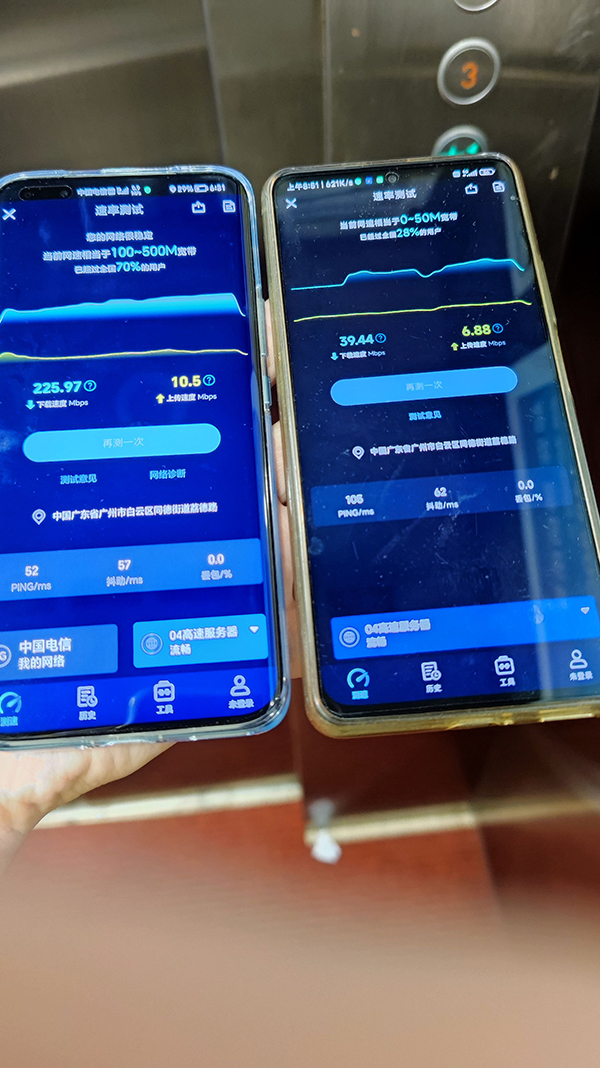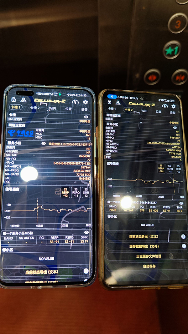 然后是電梯。此時(shí)兩部手機(jī)的信號(hào)強(qiáng)度都有所下降,榮耀Magic5 Pro是-92dBm,而紅米K40 Pro是-101dBm,榮耀Magic5 Pro優(yōu)于紅米K40 Pro。