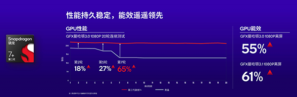 在GFX曼哈頓3.0 1080P 20輪連續(xù)測(cè)試,在進(jìn)行到第7輪以后,GPU性能領(lǐng)先超過65%。在GFX曼哈頓3.0和GFX曼哈頓3.1 1080P離屏幕測(cè)試中,能效方面相比競(jìng)品有55%和61%的提升,可謂是遙遙領(lǐng)先對(duì)手。
