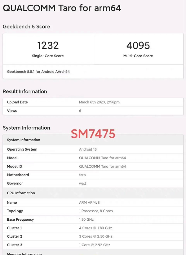 第二代驍龍7+其Geekbench5單核得分為1232分,多核得分為4095分,對比上一代驍龍7gen1提升巨大,性能接近于天璣9000和驍龍8+,跑分甚至越級超過了驍龍8gen1。