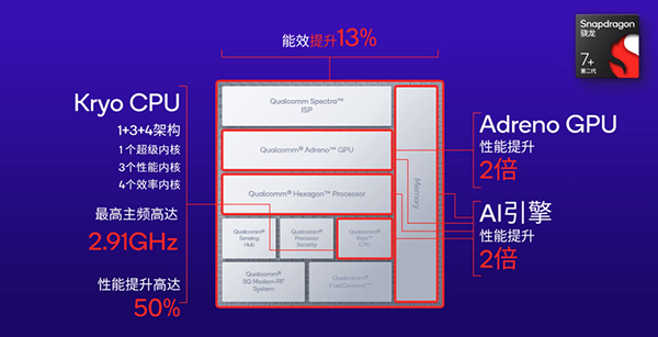 第二代驍龍7+移動平臺采用了KryoCPU,1+3+4架構(gòu),包括1個超級內(nèi)核,3個性能內(nèi)核和4個效率內(nèi)核。其中,超級內(nèi)核的主頻高達2.91GHz,CPU整體性能比上一代平臺提升了50%。