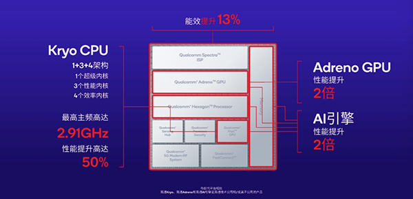 第二代驍龍7+采用Kyro CPU,相較前代產(chǎn)品,CPU性能提升高達(dá)50%;Adreno GPU性能提升2倍,在整個(gè)7系芯片歷史上是最大的一次性能提升,還實(shí)現(xiàn)了13%的整體系統(tǒng)能效提升,支持更持久的日常使用。