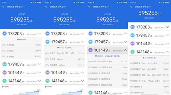 看來iQOO的調(diào)校還是挺到位的。不光是處理器升級,它的LPDDR 5內(nèi)存也表現(xiàn)不錯(cuò),連續(xù)讀寫速度在900MB/s左右,隨機(jī)讀寫也達(dá)到了250MB/s,這一點(diǎn)在千元機(jī)里面,是很容易被暗砍的。