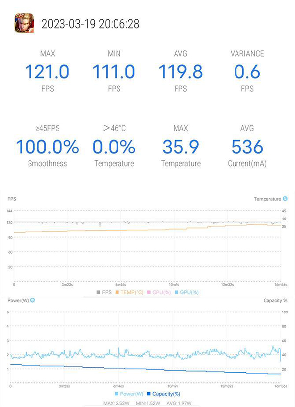 王者榮耀最 高可以開啟到極高幀率+超高分辨率,實(shí)測(cè)平均幀率119.9,接近滿幀運(yùn)行,幀率方差在0.6FPS,這個(gè)表現(xiàn)還是相當(dāng)不錯(cuò)的,要是我沒記錯(cuò)的話,120幀滿幀在千元價(jià)位應(yīng)該為數(shù)不多吧。機(jī)身最 高溫度為35.9°,平均功耗為1.97W,在高幀率的游戲下也有著低功耗低發(fā)熱的流暢體驗(yàn)。
