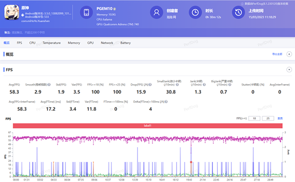 筆者在《原神》中將游戲設(shè)置為最 高畫質(zhì),傳送到須彌城后進(jìn)行半小時(shí)的繞城跑圖測(cè)試。通過PerfDog的幀數(shù)監(jiān)測(cè)我們可以看到,OPPO Find X6 Pro跑出了58.2幀的平均幀數(shù),接近滿幀60幀的表現(xiàn)。