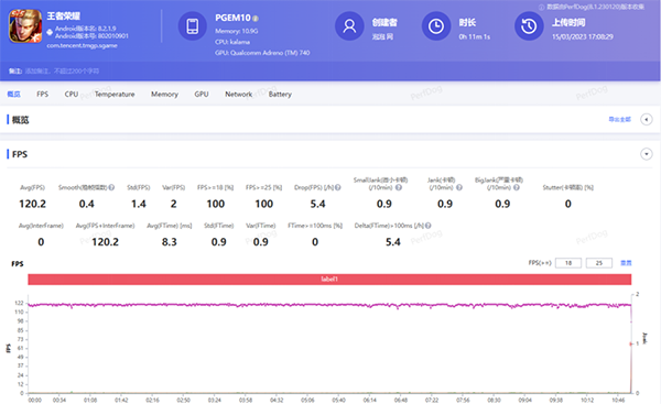 通過PerfDog對(duì)于OPPO Find X6 Pro在《王者榮耀》對(duì)局中的幀數(shù)監(jiān)測(cè),我們可以看到,其幀數(shù)曲線非常平直,基本上是跑出了一條120幀左右的直線。對(duì)局完成后, OPPO Find X6 Pro被記錄下的功耗為平均4.2W,機(jī)身最 高溫度為41.5℃。