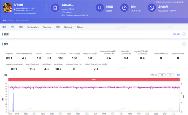 在接近半小時(shí)的《和平精英》實(shí)測(cè)后,通過PerfDog對(duì)OPPO Find X6 Pro監(jiān)測(cè)到的平均幀數(shù)為89.1幀,從幀數(shù)曲線來(lái)看,幀數(shù)并沒有出現(xiàn)很大的波動(dòng),整體也是維持在近乎一條直線的情況,平均整機(jī)功耗為4.46W。
