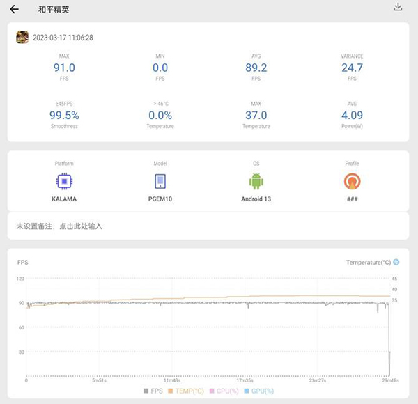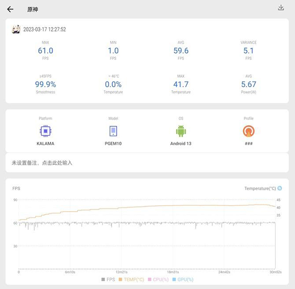 吃雞目前是適配了90幀+流暢畫質(zhì),平均幀率59.6幀,也是接近滿幀運(yùn)行了。幀率曲線偶爾有點細(xì)微波動,但實際游戲過程無感知。吃雞期間,OPPO Find X6 Pro整機(jī)最高溫度只有35.8℃,功耗則是只有4.09W。