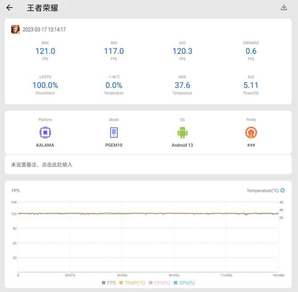 首先是王者,目前已經(jīng)OPPO Find X6 Pro已經(jīng)適配了120幀+極致畫質(zhì)。王者的平均幀數(shù)為120.3幀,整體的幀數(shù)曲線非常平穩(wěn),接近一條直線,可以說幾乎沒有波動。在實際游戲中,流暢絲滑,有著不錯的游戲體驗。游戲期間整機(jī)最高溫度為37.7℃,功耗則是5.11W。