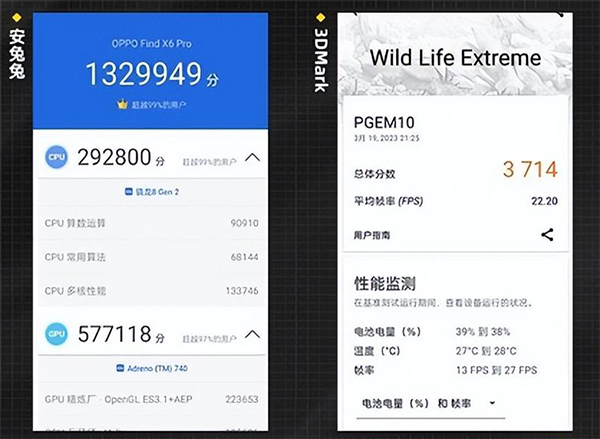 另外從整體的性能跑分來看,OPPO Find X6 Pro安兔兔跑分達到了132萬分,發(fā)揮不錯,在我們測試過的第二代驍龍8機型中也能排在前列。而在3D Mark Wild Life Extreme測試中,也取得了3714分的成績??梢?,OPPO對于新平臺的優(yōu)化還是很到位的,這意味著OPPO Find X6 Pro在應(yīng)對諸如游戲等高負載場景時也能做到游刃有余。