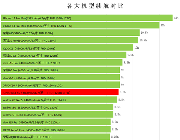 我也把近期使用過(guò)的所有機(jī)型的續(xù)航匯總?cè)缦?,大家可以看看就知道OPPO Find X6的續(xù)航大致是怎樣一個(gè)水平。