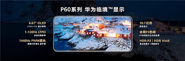 華為P60標(biāo)準(zhǔn)版正面采用了一塊6.67英寸的OLED屏幕,2700x1220分辨率,10.7億色,P3廣色域,支持1-120Hz LTPO自適應(yīng)刷新率, 1440Hz高頻PWM調(diào)光,300Hz觸控采樣率。同時支持全局色彩管理,色彩表現(xiàn)更加細(xì)膩準(zhǔn)確,華為P60系列也是全球首款支持萊茵專業(yè)色準(zhǔn)雙重認(rèn)證的手機(jī),專業(yè)顯示器色彩顯示,擁有P3精準(zhǔn)色彩投射能力。