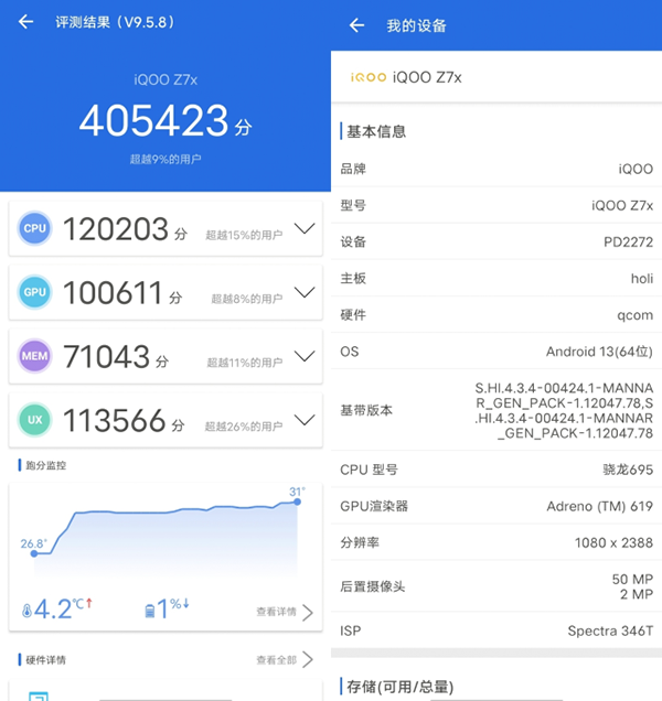 如何看一個手機的性能,相信很多人還是喜歡通過實際的跑分來看了,通過具體的跑分能看出來性能的基本水準(zhǔn)了,那咱們的這個iQOO Z7x采用了一個通驍龍695處理器,這也是中低端的處理器了,那這個手機的安兔兔跑分是多少呢,答案是405423分,基本是驍龍695芯片的正常水平。