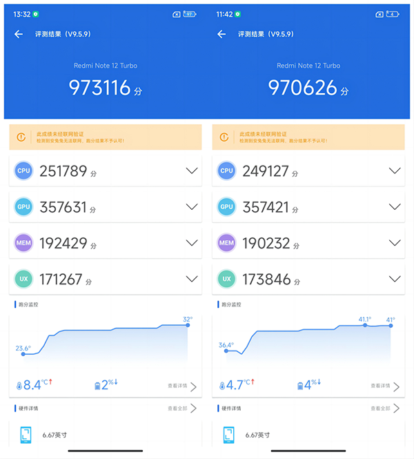 在Redmi Note12 Turbo的調(diào)校下,第二代驍龍7+移動(dòng)平臺(tái)在手機(jī)上也有著出色的性能發(fā)揮。在性能測試方面,手機(jī)的安兔兔性能測試最終成績?yōu)?73116分,值得注意的是,Redmi Note12 Turbo的性能表現(xiàn)十分穩(wěn)定,即使在電量僅剩4%的情況下,手機(jī)的跑分?jǐn)?shù)據(jù)依然可以達(dá)到970626分,并沒有因?yàn)榈碗娏慷档托阅堋?