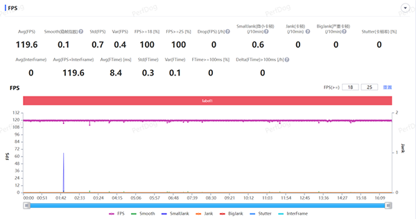《王者榮耀》在Redmi Note12 Turbo上可以設(shè)置為極高幀率,我們使用PerfDog來對手機(jī)的游戲幀率進(jìn)行測試,經(jīng)過一局游戲,Redmi Note12 Turbo運(yùn)行《王者榮耀》的平均幀率為119.6FPS,即使在團(tuán)戰(zhàn)階段游戲依舊流暢,這樣的水平已經(jīng)達(dá)到了旗艦手機(jī)的能力。