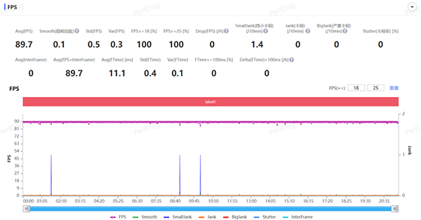 《和平精英》在流暢畫質(zhì)下也可以開啟90幀模式,帶來更流暢的游戲體驗(yàn),經(jīng)過一局游戲的測試,PerfDog顯示平均幀率為89.7FPS,同樣也是旗艦手機(jī)的水平。