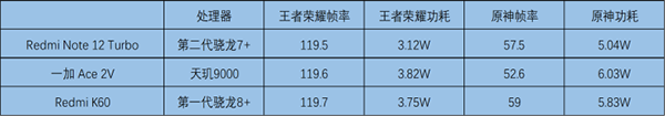 我們在游戲方面,也與其它手機進行了對比。鑒于Redmi Note12 Turbo與同價位機型的差距過大,因此這里對比了一加 Ace 2V和Redmi K60兩款手機?!锻跽邩s耀》的流暢性對于三款手機都不是問題,畢竟這款游戲的負載較低,即便在120幀的運行幀率下也沒什么性能壓力。在《原神》的體驗上,Redmi Note12 Turbo確實無法撼動自家大哥,畢竟在完全相同的系統(tǒng)調(diào)校下,芯片性能有著絕對差距,但相比一加 Ace 2V的鎖幀表現(xiàn),明顯體驗更好。