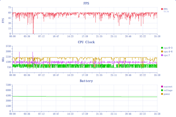 從結(jié)果來看,默認開啟性能模式的Note12 Turbo平均幀率59幀,前期的一定波動可能是由于資源加載問題,后期能明顯感受到整機溫度上升,但基本還是溫熱狀態(tài)下,戰(zhàn)斗場景較復(fù)雜的時候也會明顯的波動,不過總體都能保持流暢。