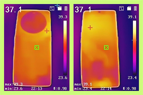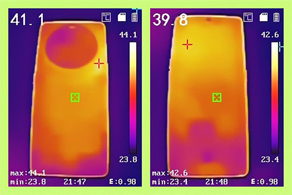 在功耗和散熱方面,整機(jī)平均功耗5.52W,表現(xiàn)還算不錯(cuò),機(jī)身最高溫度44.1℃則稍顯燙手(如下圖所示,標(biāo)紅十字為機(jī)身溫度最高處)。
