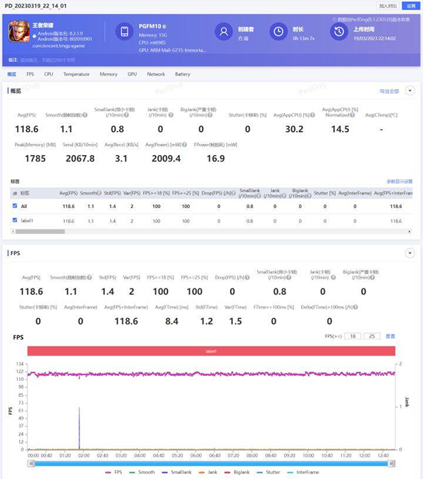 本輪測(cè)試模式為排位賽,單局游戲時(shí)長(zhǎng)13分鐘,實(shí)測(cè)平均幀率118.6FPS,穩(wěn)幀指數(shù)1.1,全程操作體驗(yàn)非常絲滑。