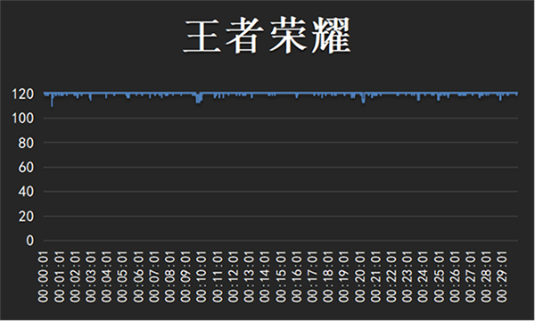 不難看出,在進行30分鐘幀率設置極高,分辨率為超高《王者榮耀》后,魅族20 Pro的平均幀率為120幀,幀率曲線就是一條直線,即便在遇到大規(guī)模團戰(zhàn)過程中也沒有掉幀現(xiàn)象,整體游戲體驗非常流暢。