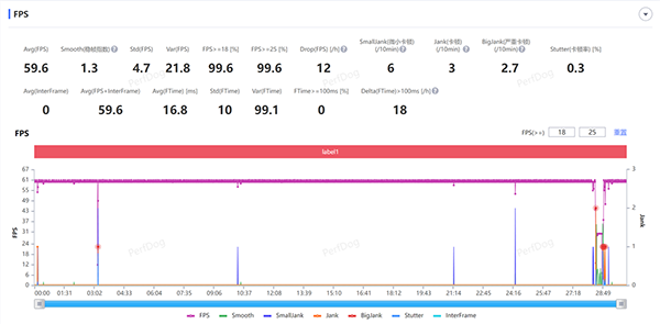 60幀的吃雞其實對于驍龍8Gen2來說就沒什么測試的必要了,不可能吃不滿,平均幀率59.6,兩次明顯的波動是成盒之后沖進游戲切換畫面造成的,和手機本身沒有關系。