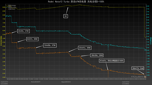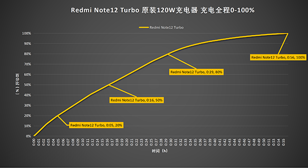 繪制出折線圖,可以看出使用原裝67W充電器為 Redmi Note12 Turbo 充至20%耗時(shí)5分鐘,充至50%耗時(shí)16分鐘,充電至84%耗時(shí)29分鐘,充電至手機(jī)UI界面顯示100%耗時(shí)41分鐘,完全充滿則需要56分鐘。