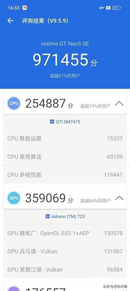 為了更好地給大家展示搭載第二代驍龍7+的真我GT Neo5 SE的性能,我們用安兔兔跑分進行了簡單的測試,在開啟GT模式后,最終跑出了971455的分?jǐn)?shù),超越67%的用戶,在性能排行中與一些搭載驍龍8的機型相當(dāng)。