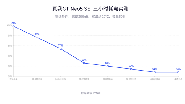 經(jīng)過(guò)三小時(shí)中度使用實(shí)測(cè),真我GT Neo5 SE最終剩余54%電量。這也直接的說(shuō)明了,真我GT Neo5 SE搭載性能高但功耗低的第二代驍龍7+,在100W充電和5500mAh大電池的加持下,日常使用完全不存在續(xù)航焦慮。