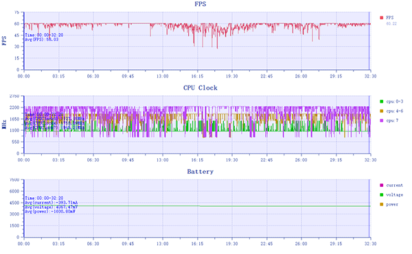測(cè)試結(jié)束后,真我GT Neo5 SE整個(gè)過(guò)程運(yùn)行的平均幀率為58.03fps,通過(guò)幀率曲線可以看到,整體來(lái)說(shuō)還是比較平穩(wěn)的,中間有一段小編被很多怪群毆,戰(zhàn)斗場(chǎng)景特效滿屏,幀率出現(xiàn)了一些波動(dòng),但不影響體驗(yàn),游玩過(guò)程中,筆者也沒(méi)有什么明顯的卡頓感,還是很流暢的。