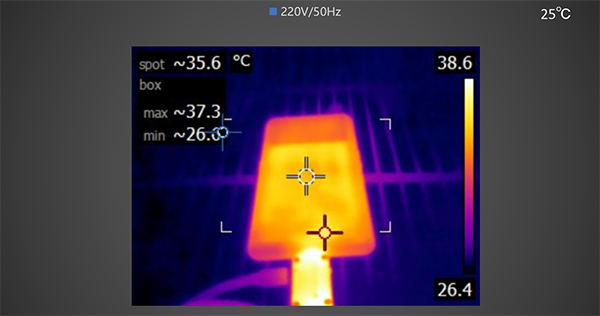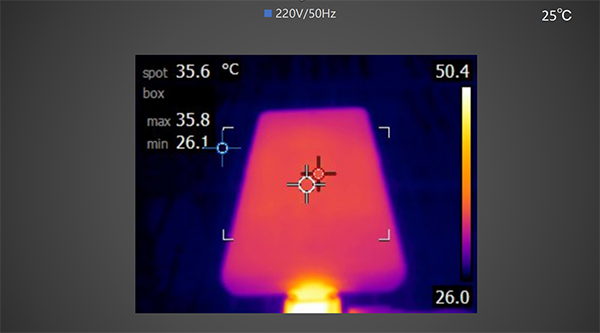 充電5分鐘后,使用熱成像儀拍攝手機正面 ,最高溫度為35.8℃。