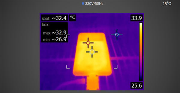 充電30分鐘后,使用熱成像儀拍攝手機背面 ,最高溫度為32.9℃。