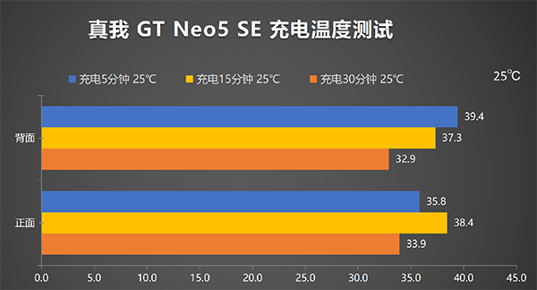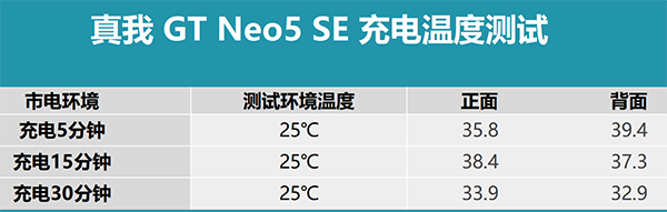尤其是手機充電發(fā)熱便是我們所需要關(guān)注的一個問題,讓我們看看真我 GT Neo5 SE對于充電時溫度的調(diào)控如何,測試全程在25℃恒溫箱中進行,溫度拍攝的時間點為:充電5分鐘、充電15分鐘、充電30分鐘。