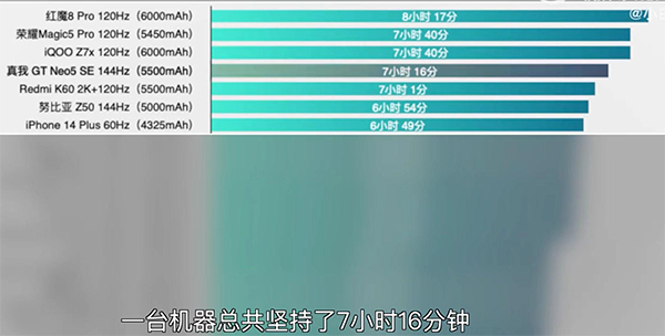 新機(jī)發(fā)布后,各路數(shù)碼大神都對真我GT Neo5 SE進(jìn)行了真機(jī)評測。我們從數(shù)碼達(dá)人小白評測中就可以清楚的看到作為真我GT Neo5 SE最大亮點的續(xù)航能力在實測表現(xiàn)上也是非常的亮眼,從天梯圖來看,真我GT Neo5 SE在使用三小時輕度測試中,剩余67%的電量,在五小時的重度測試中,剩余23%的電量,在極限續(xù)航直到干到關(guān)機(jī)的測試下,堅持了7個小時16分鐘,成功突破7小時大關(guān)。在眾多旗艦級手機(jī)中排名第四。整體表現(xiàn)比同一價位的紅米Note12 Turbo出色。
