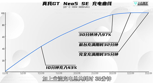 尤其是真我GT Neo5 SE在有著超強(qiáng)續(xù)航能力的同時,其充電速度的表現(xiàn)也是禁得起考驗。根據(jù)小白評測公布的數(shù)據(jù)來看,新機(jī)只需要10分鐘就能有43%的電量,半小時就可以達(dá)到97%,35分鐘就可以完全充滿達(dá)到100%。經(jīng)過1600次充放電循環(huán)后,電池有效容量不低于80%。