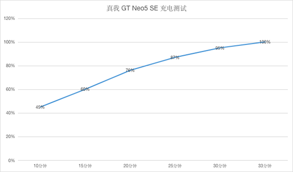 當(dāng)然,真我GT Neo5 SE的優(yōu)勢不僅是續(xù)航,還有百瓦快充。實測快充表現(xiàn),10分鐘充入45%,15分鐘充至60%,充滿電量僅花費(fèi)了33分鐘。對于擁有5500mAh這種超大容量的電池的機(jī)型來說,半個小時出頭能徹底充滿電量,基本滿足大部分用戶的現(xiàn)實需求了。