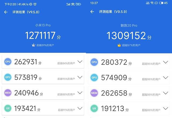 在跑分方面,大家可以很輕易的發(fā)現(xiàn)小米13 Pro和魅族20 Pro之間的差異。魅族20 Pro的安兔兔得分為1309152分,小米13 Pro的跑分為1271117分,二者之間有著近4萬分的差異。