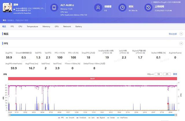 華為Mate X3仍然使用了4G版驍龍8+處理器,不過其性能表現(xiàn)已經(jīng)足夠出色。為了實(shí)際測試其性能表現(xiàn),我們直接使用《原神》對其進(jìn)行了測試,在極高畫質(zhì)+60幀的設(shè)定下,華為Mate X3的平均幀率為59.9幀。幀率曲線較為平緩,實(shí)際游戲體驗(yàn)沒有明顯卡頓,達(dá)到了驍龍8+處理器的平均水平。