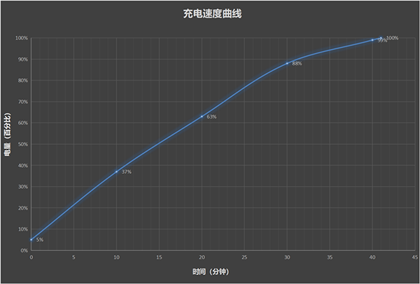 經(jīng)過測試,電量從5%開始充電10分鐘,電量達(dá)到37%,20分鐘充電至63%,半小時電量充至88%,完全充滿僅需41分鐘,這樣的充電速度,日常洗漱的時間就能充到近一半的電量,用個大半天也不成問題。