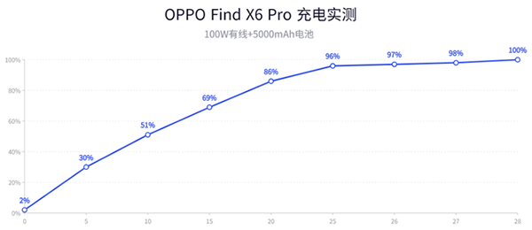 我們也對(duì)OPPO Find X6 Pro的充電性能進(jìn)行了實(shí)際測(cè)試,實(shí)測(cè)10分鐘可將手機(jī)從2%電量充至51%,28分鐘充滿至100%,基本符合官方宣傳的充電速度。