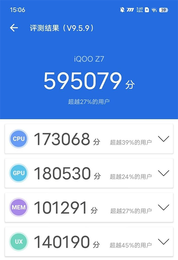 實測安兔兔跑分超過59萬分,也要高于778G機型的53萬分左右。