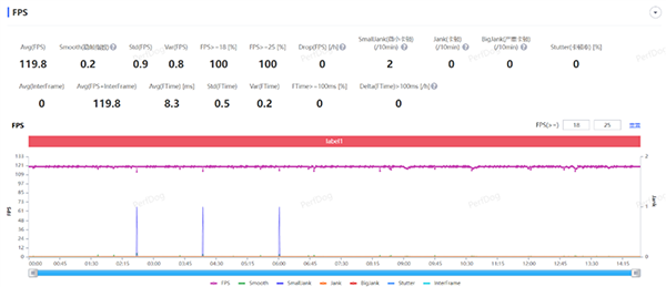 首先是王者榮耀手游的測(cè)試,在開(kāi)啟高清畫(huà)質(zhì)+極高幀率下,經(jīng)過(guò)一局團(tuán)戰(zhàn)近15分鐘的游戲測(cè)試,平均幀率達(dá)到119.8FPS,幀率波動(dòng)僅有0.9FPS,整體幾乎沒(méi)有任何波動(dòng),驍龍782G面對(duì)這類較低負(fù)載的游戲可流暢運(yùn)行。