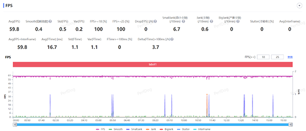 在和平精英手游中,在極限幀率下可以開(kāi)啟流暢畫(huà)質(zhì),游戲以最高60FPS運(yùn)行,經(jīng)過(guò)一局對(duì)戰(zhàn)近16分鐘的測(cè)試,平均幀率維持在了59.8FPS,游戲整體的幀率曲線依舊非常平穩(wěn)。