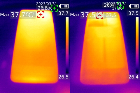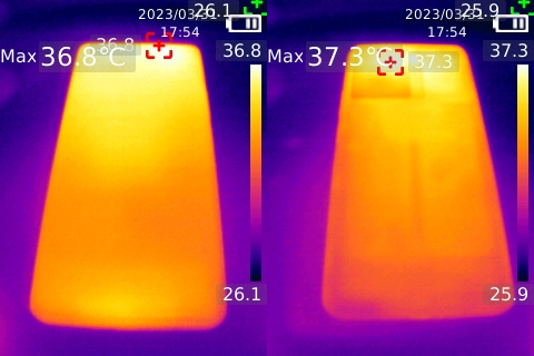 這么低的功耗,溫度自然也不會(huì)高,經(jīng)過(guò)3局游戲近8分鐘的測(cè)試,機(jī)身正面僅有36.8攝氏度,機(jī)身背面也僅有37.3攝氏度。